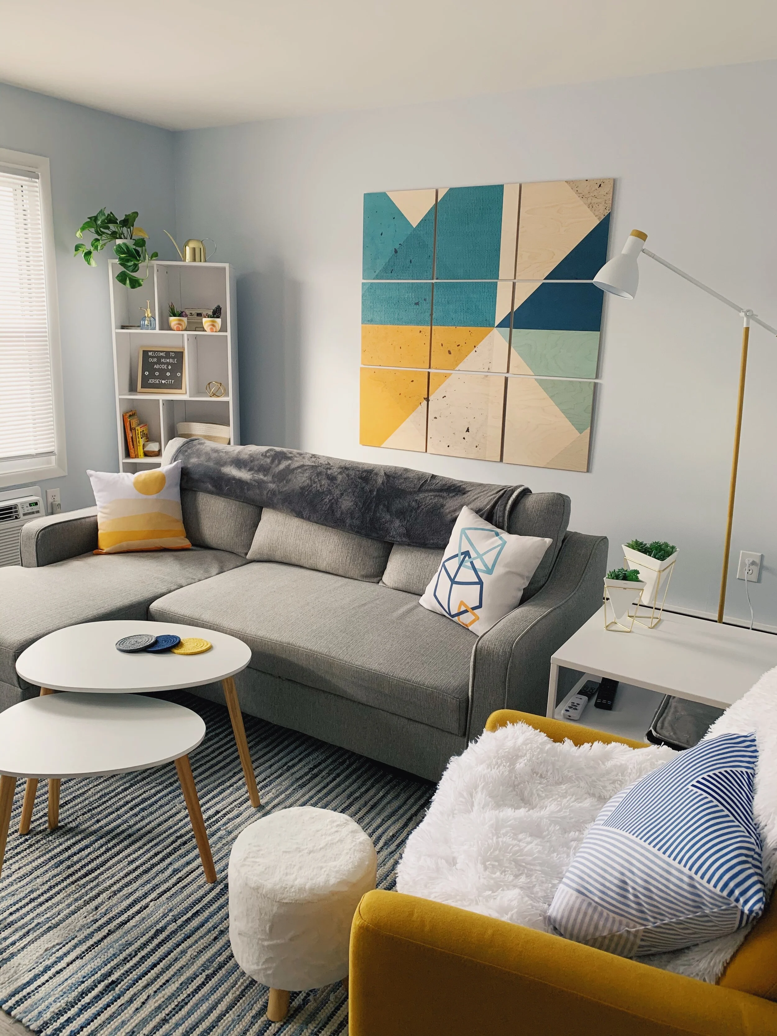 For this rental, the landlord recently renovated the home with light blue walls and a grayish/brown floor. Painting was not allowed. To embrace the color and keep the home bright, we went with a gray and white palette, focusing on pops of blues and golden yellows. The androgynous nature of this room played well for the couple as they both felt equally comfortable in this space. The large wooden painting filled the incredibly large wall and pulled the focus back to the center of the room. This helped with the cozy vibe the couple was seeking.