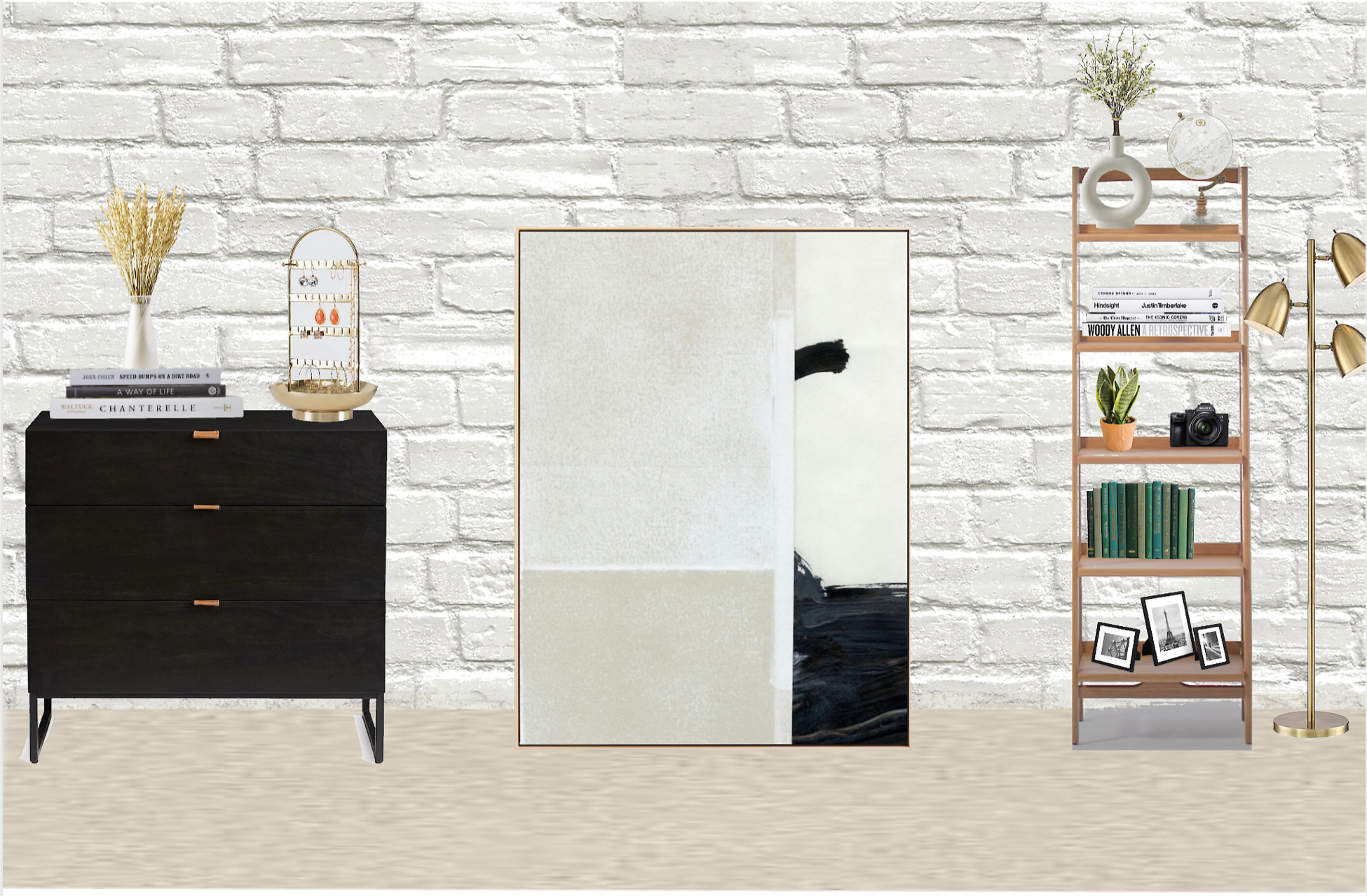 For this rental, the client wanted to redo the entire space, bringing a more upscale and zen environment. The plan is to paint the walls off-white or white (as these are colors the landlord is OK with keeping) and leave the carpet as it is not an option in this rental. The carpet is quite plush, so incorporating thinner area rugs on top will help separate the space. We will bring in black furniture with wooden and gold accents to add a clean and cozy bedroom vibe. A large floor painting will be a perfect focal point for the brick wall and will help separate the getting ready area and the bookcase. This is currently in-progess and will updated once completed.